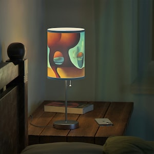 This unique table lamp stand features a steel base that comes with a classy finish in silver or white. The shade of the lamp is available in 10 different trim colors and can accommodate all my designs in high-resolution printing.